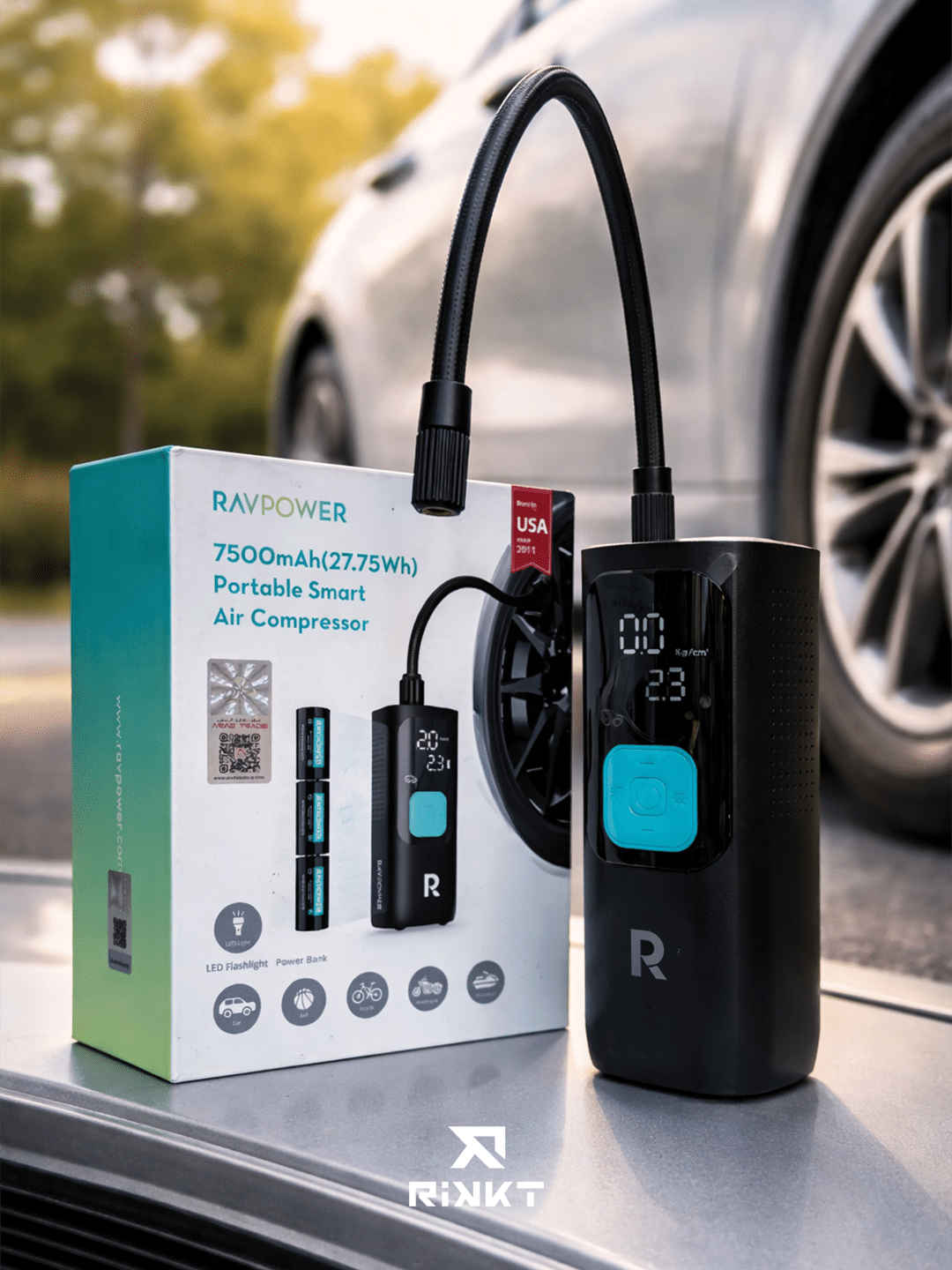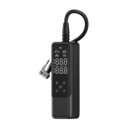 The RAVPOWER RP-PB1233 is a portable 3-in-1 smart air compressor with an accurate LCD display, built-in power bank, and LED flashlight. Designed for fast and safe inflation, it is ideal for cars, motorcycles, bicycles, balls, and everyday roadside emergencies.
